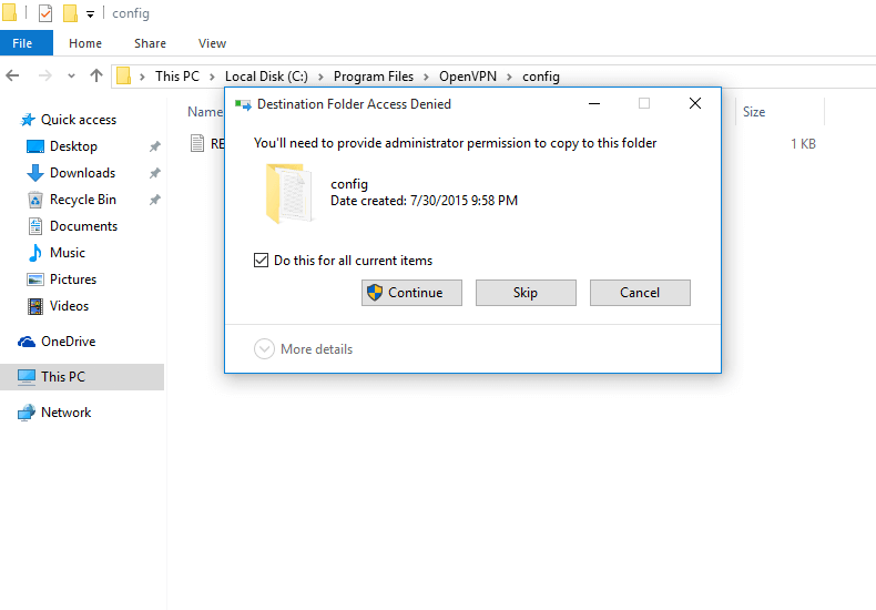 Download OpenVPN Configuration Files according to your VPN Plan and unzip them. Copy all files to the OpenVPN configuration folder (by default C:/Program Files/OpenVPN/config/) and confirm the Windows security messages.