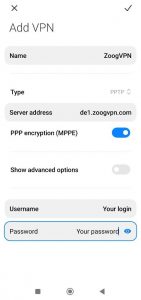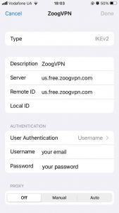 4. Następnie musisz wprowadzić szczegóły, aby połączyć się z ZoogVPN. Poniższy zrzut ekranu pokazuje, jak poprawnie wypełnić wszystkie pola, aby pomyślnie nawiązać połączenie. Możesz wypełnić pola Server i Remote ID serwerami, które można znaleźć na swoim koncie, na naszej stronie internetowej oprócz określonego serwera. Aby zapisać ustawienia, wystarczy kliknąć przycisk “Done” w prawym górnym rogu.