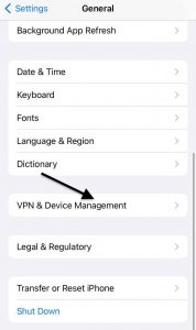 2. Następnie przejdź do “VPN & Device Management”, jak pokazano na poniższym zrzucie ekranu.