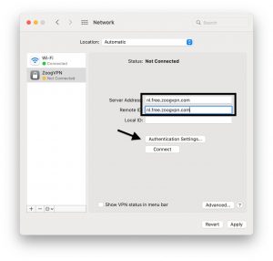 4. Następnie należy wypełnić dwa pola, nazwy serwerów, oprócz określonego serwera można również wprowadzić inne serwery, które chcesz. Możesz znaleźć dostępne serwery na swoim koncie na naszej stronie internetowej w sekcji lokalizacji serwerów. Po wypełnieniu pól z nazwą serwera, kliknij “Authentication Settings”.